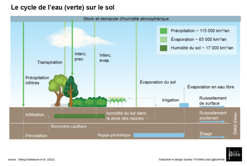 L’eau verte est pourtant essentielle au fonctionnement du cycle de l’eau : elle joue un rôle crucial dans le maintien de l’humidité des sols, la résilience de la biosphère, la sécurisation des puits de carbone et la régulation de la circulation de l’eau dans l’atmosphère. Plus généralement, les perturbations du cycle de l’eau en général sont des menaces qui pèsent sur la résilience des écosystèmes. En effet, le dérèglement du cycle de l’eau contribue à deux phénomènes dangereux : l’eau peut s’accumuler dans l’atmosphère et augmenter les effets de gaz à effet de serre, ou ne plus être absorbée par les sols et ainsi accélérer la montée des eaux.