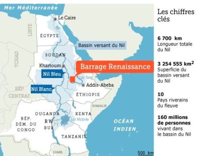 Cet ouvrage titanesque, qui deviendra la plus grande centrale hydroélectrique d’Afrique, suscite de grandes craintes des pays voisins. Le Nil Bleu, qui prend sa source en Éthiopie, rejoint en effet le Nil blanc à Khartoum pour former le Nil qui traverse le Soudan et l’Égypte avant de se jeter dans la Méditerranée. Le Soudan, favorable sur le principe, réclame sa part d’électricité. L’Égypte, quant à elle, tire du Nil 90% de son eau potable, agricole ou industrielle. Elle craint que ce gigantesque barrage entraîne une réduction du débit du fleuve et que l’eau soit dérivée en amont pour l’irrigation notamment.