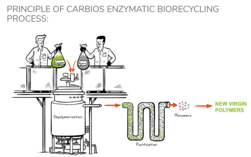 Au sein d’une installation-pilote à Clermont-Ferrand, les bouteilles en plastique sont broyées et placées dans des cuves, où sont ajoutés de l’eau et les enzymes développées par Carbios. Ces dernières sont fabriquées par une bactérie que l’on retrouve dans les composts végétaux et qui permet de détruire les couches protectrices des plantes, appelées les cuticules. Le procédé chimique vise à casser les chaînes qui composent le plastique jusqu’à l’obtention de ses constituants monomères initiaux : les acides téréphtaliques et l’éthylène glycol. Ce processus de dépolymérisation entraîne la destruction de plus de 90 % du plastique en un temps réduit : entre 10 et 24 heures. Cette innovation, qui a déjà fait l’objet d’une dizaine de brevets, permet ainsi de réduire les déchets et revaloriser les matières plastiques.