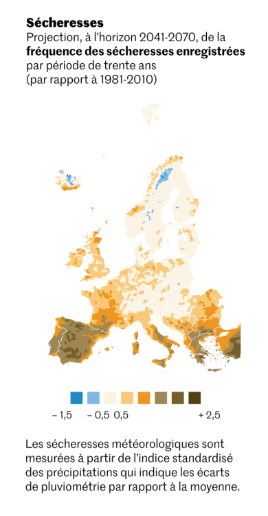 Pour mieux alerter la population mais aussi interpeller la Commission européenne, les chercheurs ont retranscrit sous forme de cartes leur modélisation des changements, en s’appuyant sur les scénarios du GIEC. Une carte montre ainsi pour chaque phénomène ce qui se passera si des mesures sont prises et appliquées, une autre les conséquences si rien n’a été fait.