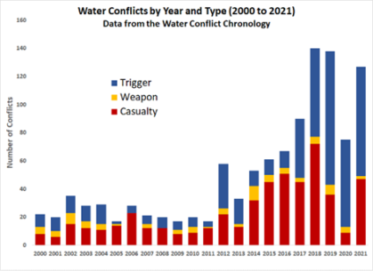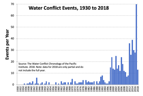 Selon le Pacific Institute, les conflits liés à l’eau sont en nette augmentation dans le monde. La base de données « Water Conflict Chronology », créée par le centre de recherche dans les années 1980 et dont la dernière mise à jour a été publiée en mars 2022, propose une catégorisation et un archivage de tous les épisodes violents autour de l’eau depuis la plus ancienne guerre de l’eau connue, dans l’ancienne Mésopotamie, il y a 4 500 ans. Si les ressources en eau n’ont jamais été, ou très rarement, la seule source de conflits ou de guerres, le Pacific Institute soutient que la relation entre eau et sécurité est aujourd’hui largement sous-estimée dans les analyses géopolitiques.