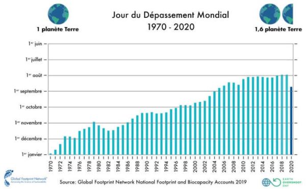 Selon l’institut de recherche américain Global Footprint Network, qui calcule chaque année le « jour de dépassement de la Terre » (jour théorique à partir duquel l’humanité a consommé toutes les ressources que les écosystèmes peuvent produire en une année), 2020 verra cette date fatidique reportée de trois semaines, au 22 août, en raison des mesures mondiales de confinement.