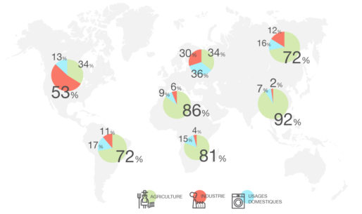 Le secteur agricole représente en moyenne 22 % des volumes totaux d’eau prélevée en Europe. Toutefois, la situation est très disparate, certains pays du sud de l’Europe recourant systématiquement à l’irrigation pour leur agriculture, qui monopolise à elle seule jusqu’à 80 % des prélèvements. L’irrigation peut, dans ces pays, multiplier par six la production agricole et par quatre les bénéfices des exploitations. Une même disparité s’observe pour la réutilisation des eaux usées traitées (ou « Reuse »), en fonction de réglementations nationales plus ou moins contraignantes : la France n’y recourt qu’à 0,6 % contre 9 % en Italie et 13 % en Espagne. Globalement, la pratique reste encore peu développée en Europe.