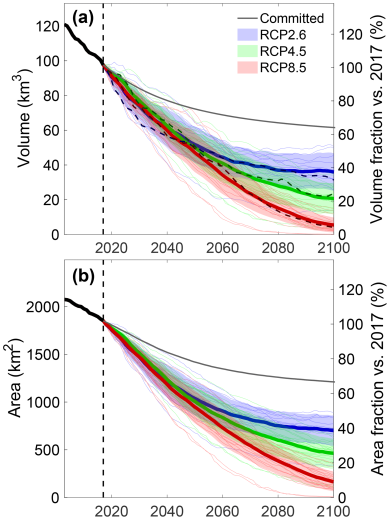 - Dans un scénario optimiste, impliquant un réchauffement limité des températures (en dessous de 2°C à la fin du siècle), les glaciers perdraient environ les deux tiers de leur volume de glace actuel.