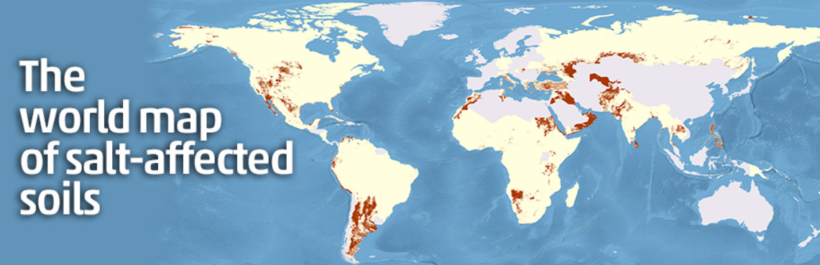 Près d’un milliard d’hectares de sols dans le monde (soit 8,7 %) sont touchés par le phénomène de salinisation, essentiellement en zones arides ou semi-arides, en Afrique, Asie ou en Amérique latine. Ce chiffre inédit est tiré de la carte mondiale mise au point par la FAO avec l’appui de 118 pays et des centaines de collecteurs de données.