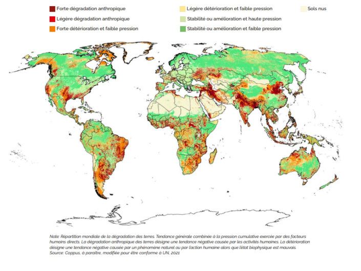 « Des systèmes au bord de la rupture » : c’est par ce sous-titre que le rapport fait état d’une dégradation alarmante des ressources en sols, en terres et en eau de la planète. Si le précédent rapport, publié en 2011, attirait déjà l’attention sur le fait qu’un grand nombre des écosystèmes terrestres et aquatiques étaient en danger, celui-ci indique que la pression actuelle a atteint un niveau critique alors même que la demande d’aliments et d’énergie est en hausse. Les sols travaillés de manière conventionnelle sont sources d’émissions de dioxyde de carbone et autres gaz à effet de serre. En 2019, les émissions anthropiques mondiales s’élevaient à 54 milliards de tonnes d’équivalent CO2, dont 31 % issues des systèmes agroalimentaires. Quant au couvert forestier, précieux indicateur de la santé du climat, il est en perte de 4,7 milliards d’hectares/an depuis dix ans.