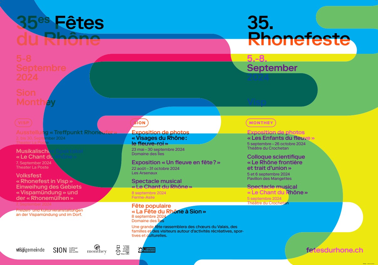 Apres 20 ans d’absence, Les Fêtes du Rhône sont relancées en 2024, avec pour objectif d’activer le symbole du Rhône comme trait d’union. L’originalité du projet des 35es Fêtes du Rhône 2024 consiste à mettre en valeur un territoire en associant trois villes qui jalonnent le Rhône valaisan, Monthey où se tiendra le colloque scientifique (5-6 septembre 2024), Sion (avec une grande fête populaire le 8 septembre 2024) et Viège (le 7 septembre 2024) : l’idée est ainsi de remonter le Rhône, du lac au glacier.
